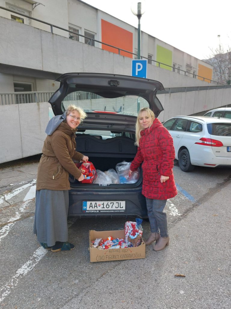 12. 6. ich pani učiteľka Hana P., ktorá zbierku organizovala, spolu s pani riaditeľkou odovzdala pracovníčke zo Slovenskej katolíckej charity, ktorá ich následne prerozdelí do rodín v hmotnej núdzi.